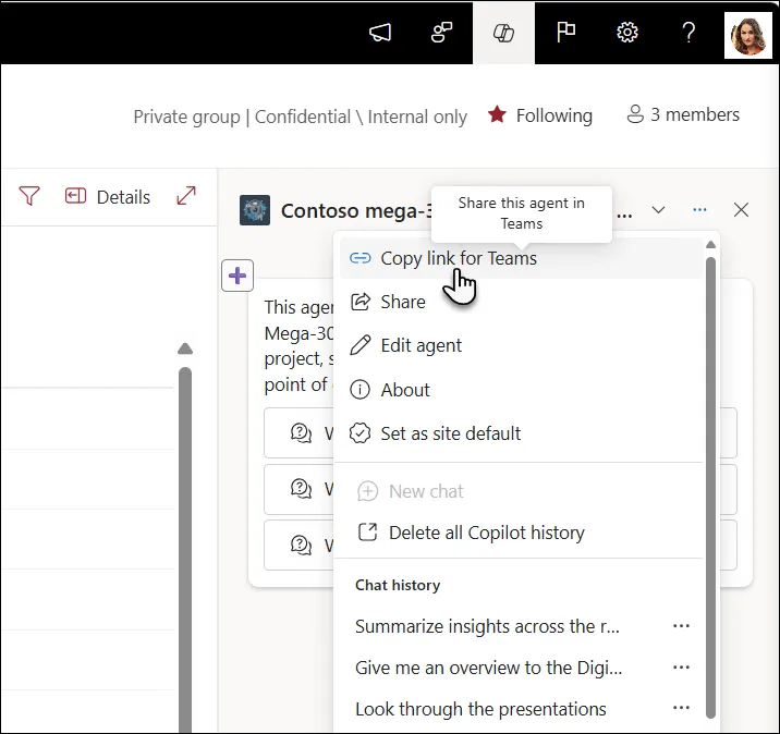 - Les membres d’une équipe projet peuvent partager un Agent SharePoint dans leur canal Teams pour avoir accès à leurs informations et documents de travail plus facilement, collaborer de manière plus fluide, et atteindre leurs objectifs plus efficacement