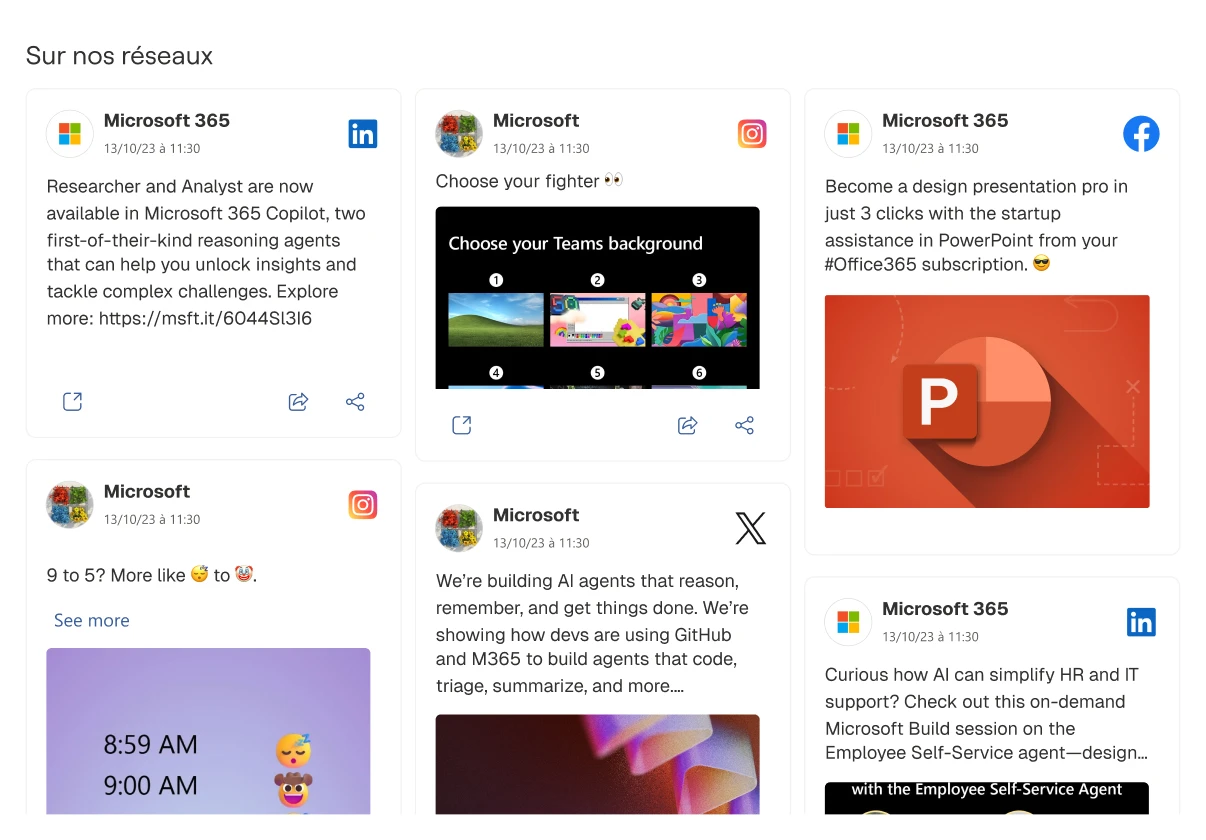 Affichez vos flux LinkedIn, YouTube, Instagram ou RSS en temps réel sur votre intranet.