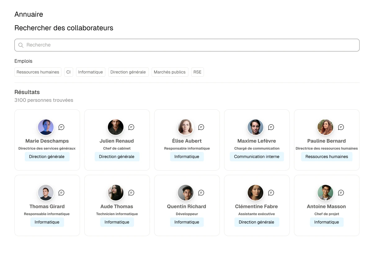 Trouvez des collègues en quelques clics, par rôle, service ou site.
