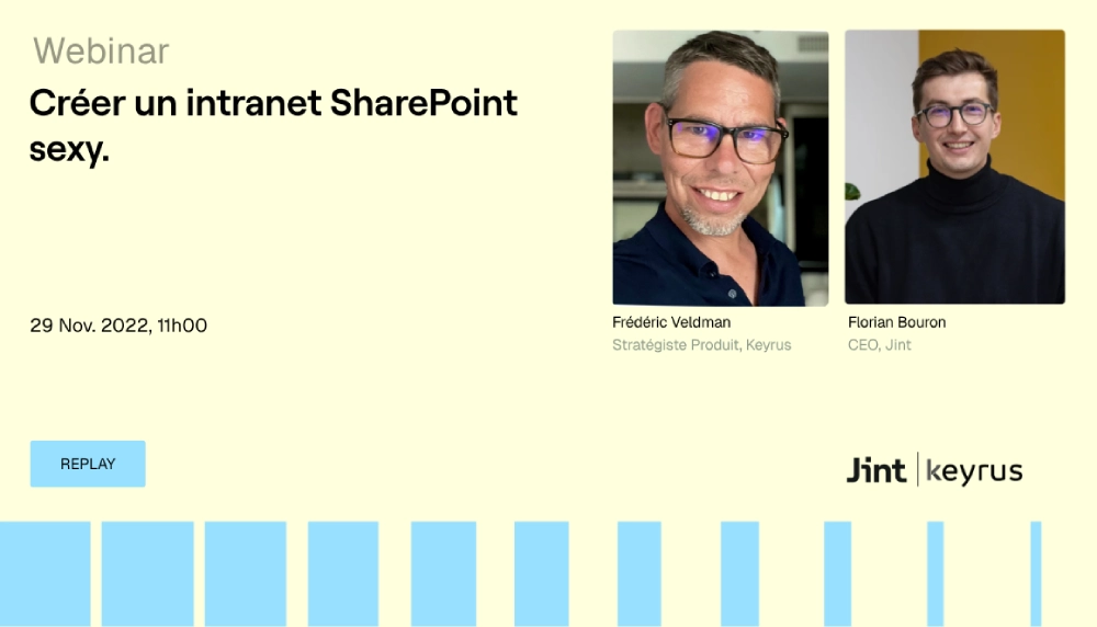 Revivez notre webinaire sur la création d'un intranet SharePoint attrayant, au cours duquel Keyrus et Jint ont discuté de leurs observations sur les expériences numériques, des possibilités graphiques et des limites de SharePoint Online, de la résolution de ces limites avec Jint SharePoint, et de cas pratiques pour améliorer l'apparence de l'intranet.