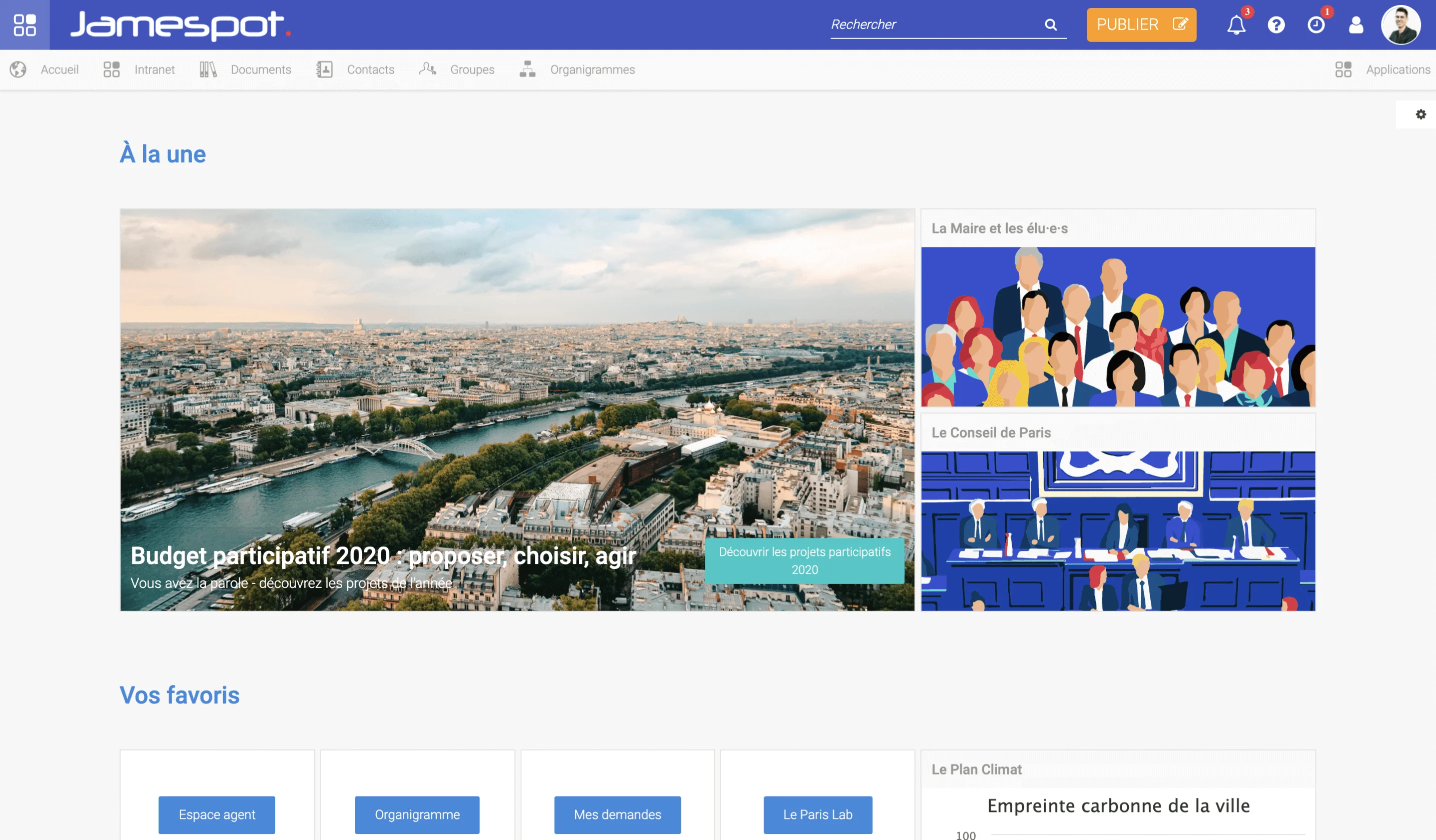 Jamespot offers a modular intranet that can be activated block by block depending on your use: field feedback, document sharing, newsletters, team engagement. With its collaboration tools, collaborative spaces, and AI agents (Jamesbot & Extrabots), it allows you to build an intranet in your own image. It is particularly popular among public sector entities, associations, and mission-driven companies.